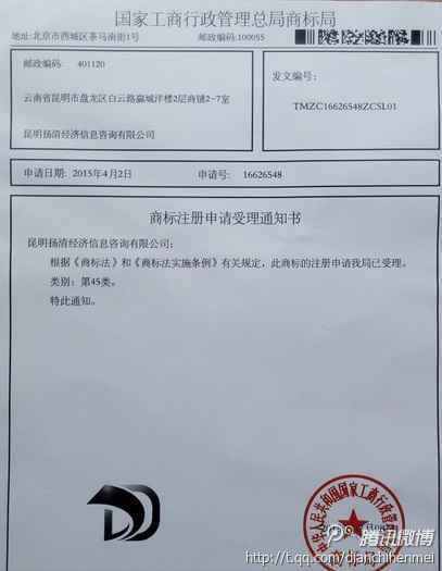 8月26日大德调查收到商标申请受理通知书!2015年3月,大德启动商标战略,4月2日正式向中国工商总局商标局提交申请文书。受理通知书下发,申请进度再进一步。商标申请是个漫长过程,前后需要近一年时间。大德调查立足长远,花费大量精力申请商标,立志打造昆明私家侦探第一品牌!