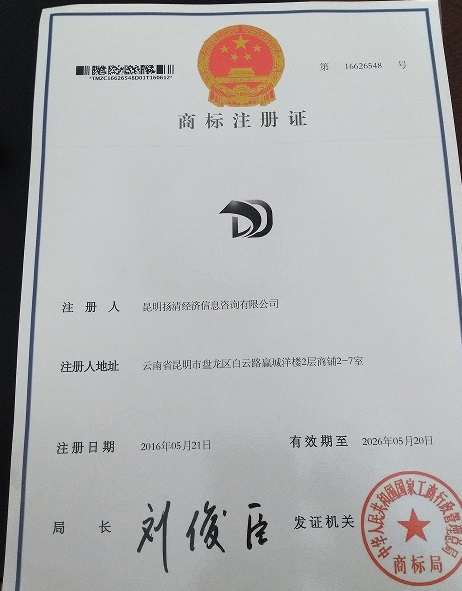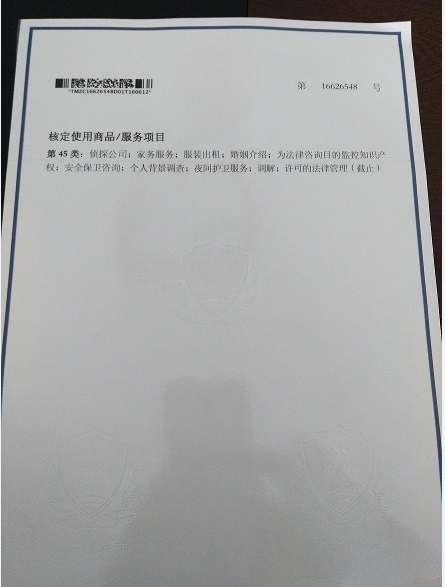 商标注册成功,大德调查创昆明私家侦探历史 2015年2月,大德调查启动商标战略,4月确定商标方案,4月12日向国家商标总局提出45类商标申请,历经漫长的审查,公示,2016年5月21日终于成功注册!6月28日,商标注册证书送达周先生手上。在昆明私家侦探行业属于首家,大德调查再次领先同行。